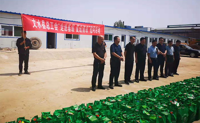 7月31日,文水縣總工會2019年度“夏送清涼”慰問團抵達我公司文水縣生態(tài)修復項目部,縣人大常委會副主任、總工會主席任守云,縣政府黨組成員、開柵鎮(zhèn)黨委書記任應福,縣總工會常務副主席王志杰,副主席武吉明及開柵鎮(zhèn)、村相關領導為奮戰(zhàn)在高溫一線的施工人員發(fā)放防暑降溫慰問品200份,集團董事長康偉出席活動。